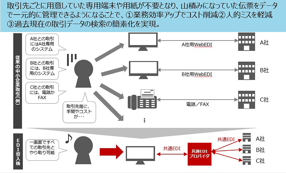 中小企業の生産性向上を図るため、2018年4月に仕様策定された「中小企業共通EDI標準」。受発注業務のIT化に取り組むことで、あらゆる業種で生産性向上の効果が期待できます。